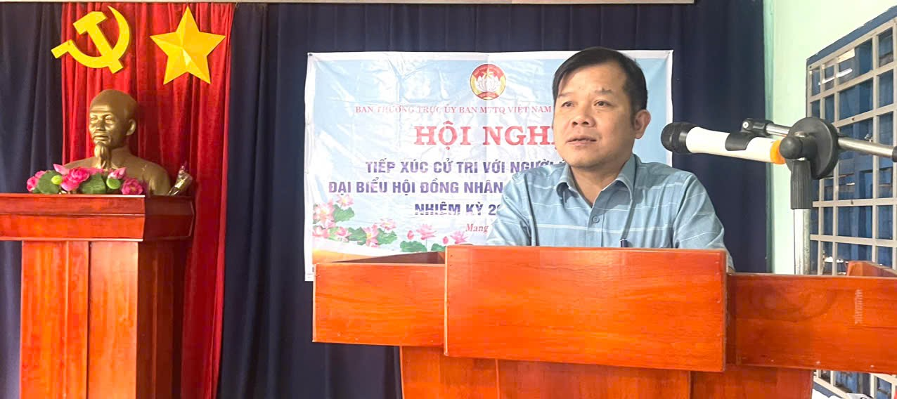 Ông Đoàn Như Kiên – Phó Bí thư Thường trực Đảng ủy xã trình bày chương trình hành động của mình Hội nghị tiếp xúc cử tri với người ứng cử đại biểu HĐND xã Mang Yang nhiệm kỳ 2026–2031 tại đơn vị bầu cử số 1