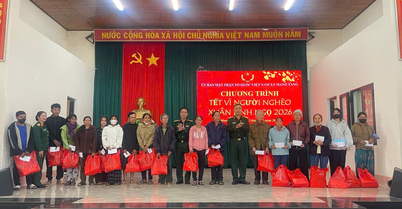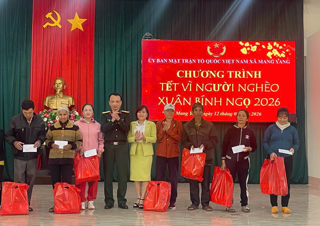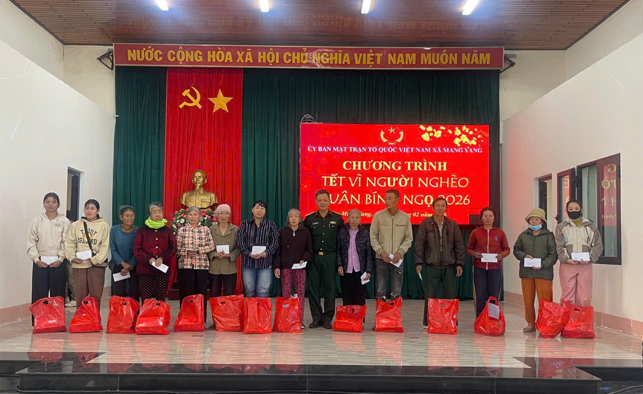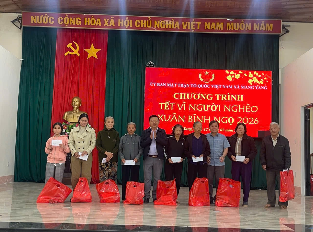 Ngày 12/02, Ủy ban Mặt trận Tổ quốc Việt Nam xã Mang Yang tổ chức Chương trình “Tết vì người nghèo” Xuân Bính Ngọ năm 2026 nhằm chăm lo, hỗ trợ các hộ nghèo, hộ cận nghèo và gia đình có hoàn cảnh khó khăn trên địa bàn xã.