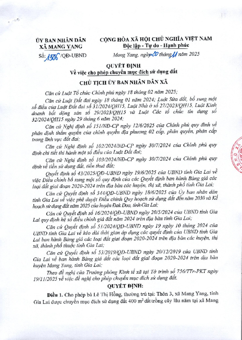 | Số hiệu | 1506/QĐ-UBND | Cơ quan ban hành | UBND Xã Mang Yang |