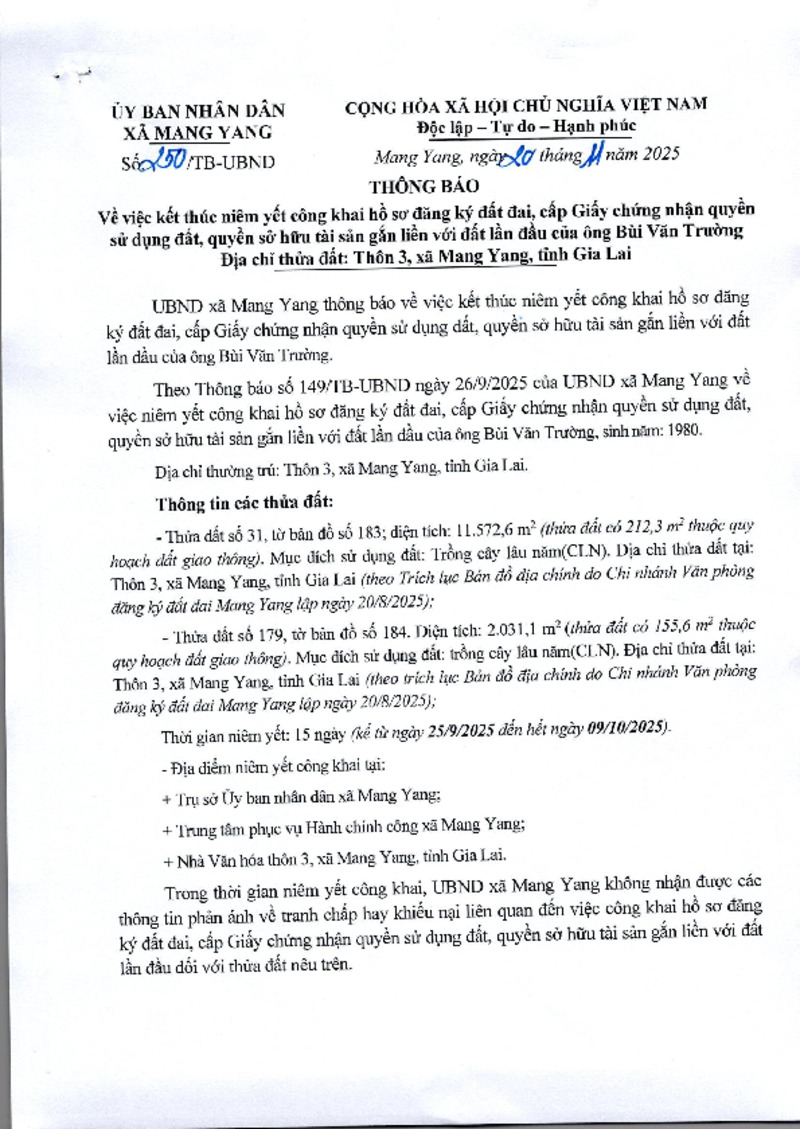 | Tiêu đề văn bản | Thông báo về việc kết thúc niêm yết công khai hồ sơ đăng ký đất đai, cấp Giấy chứng nhận quyền sử dụng đất, quyền sở hữu tài sản gắn liền với đất lần đầu của ông Bùi Văn Trường Địa chỉ thửa đất: Thôn 3, xã Mang Yang, tỉnh Gia Lai | ||