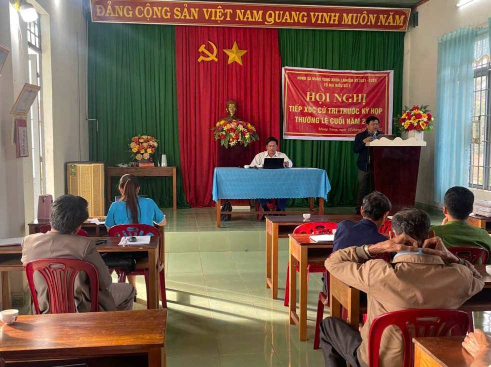 Chiều ngày 10/12, Tổ đại biểu số 1 – Hội đồng nhân dân xã Mang Yang đã tổ chức Hội nghị tiếp xúc cử tri trước Kỳ họp thường lệ cuối năm 2025 tại thôn 1 và thôn 3. Tham dự Hội nghị có tổ đại biểu HĐND xã, đại diện lãnh đạo các ban ngành của xã cùng 40 cử tri hai thôn.