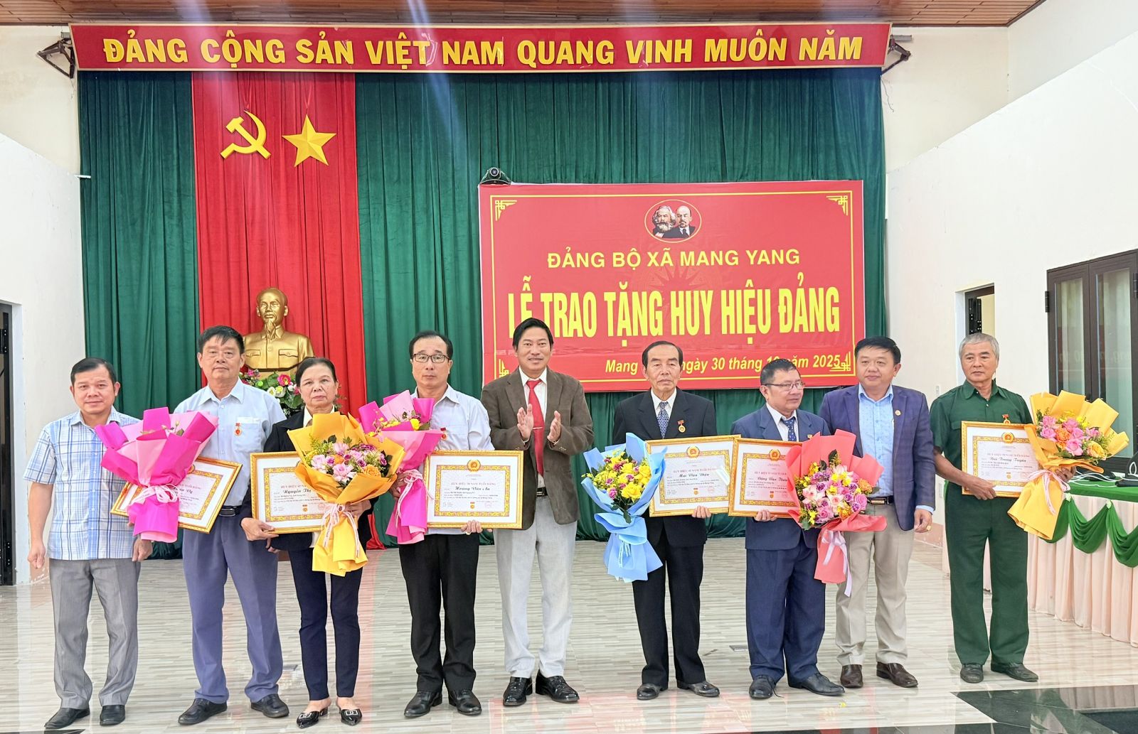 Tại buổi lễ, đại diện Ban Tổ chức đã công bố các quyết định của Ban Thường vụ Tỉnh ủy Gia Lai về việc tặng Huy hiệu Đảng đợt 7/11/2025 cho 08 đảng viên thuộc Đảng bộ xã Mang Yang. Trong đó, có 01 đồng chí được tặng Huy hiệu 55 năm tuổi Đảng, 01 đồng chí 50 năm tuổi Đảng, 02 đồng chí 45 năm tuổi Đảng, 01 đồng chí 40 năm tuổi Đảng và 03 đồng chí 30 năm tuổi Đảng.