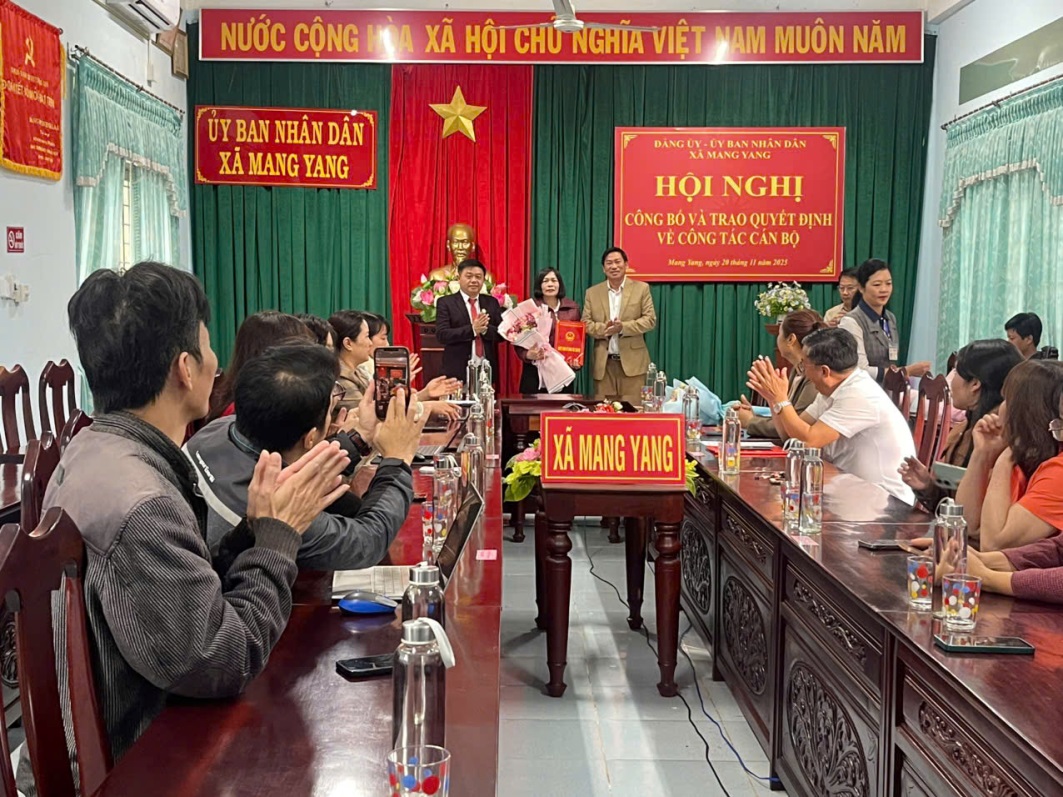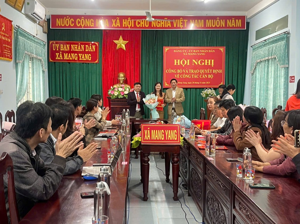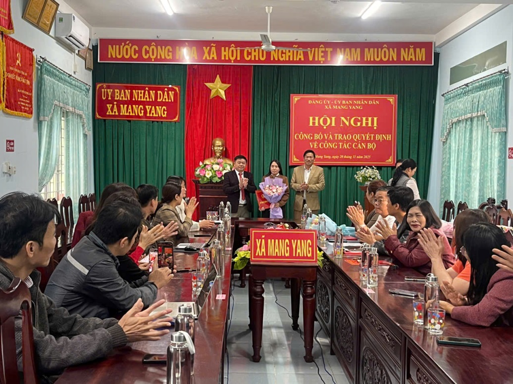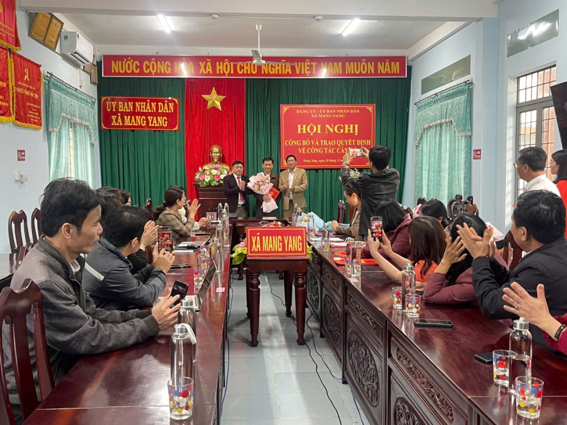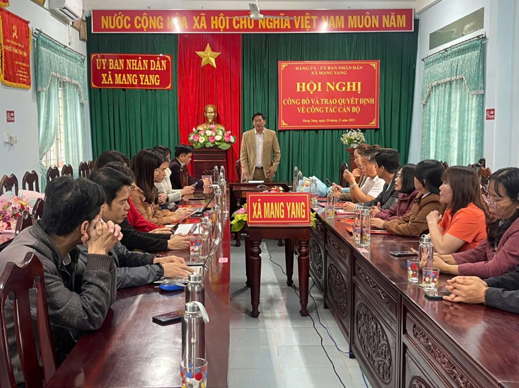 Ngày 20/11, Đảng ủy, UBND xã Mang Yang tổ chức Hội nghị Công bố và trao Quyết định về công tác cán bộ. Tham dự Hội nghị có đồng chí Lê Trọng – Bí thư Đảng ủy, Chủ tịch HĐND xã; đồng chí Võ Lê Xuân Thiện – Chủ tịch UBND xã.
