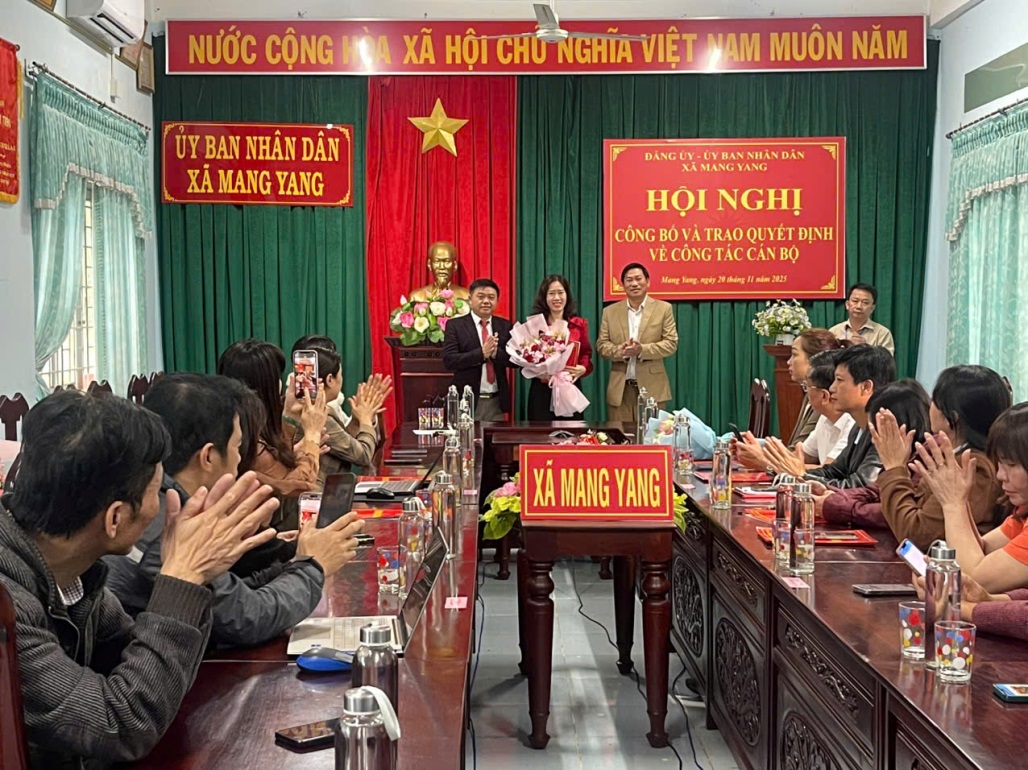 Tại Hội nghị, Đảng ủy xã đã công bố và trao Quyết định tiếp nhận và bổ nhiệm bà Nguyễn Thị Cẩm Thúy, Phó Chánh Văn phòng Đảng ủy, đến công tác tại Văn phòng HĐND và UBND xã; đồng thời bổ nhiệm giữ chức vụ Phó Chánh Văn phòng HĐND và UBND xã Mang Yang. Thời hạn bổ nhiệm 5 năm, kể từ ngày 20/11/2025. Bà Nguyễn Thị Cẩm Thúy được hưởng phụ cấp chức vụ lãnh đạo theo quy định hiện hành.