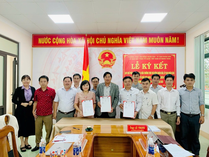 Chiều ngày 24/10, Thường trực Hội đồng nhân dân xã đã tổ chức Lễ ký kết Quy chế phối hợp công tác giữa Thường trực HĐND, UBND và Ủy ban MTTQ Việt Nam xã Mang Yang nhiệm kỳ 2021-2026 và Chương trình phối hợp năm 2025. Tham gia Lễ ký kết có Thường trực Đảng ủy xã; Thường trực HĐND xã: Chủ tịch HĐND, Trưởng các Ban HĐND xã; Đại diện UBND xã: Chủ tịch UBND xã, Phó Chủ tịch UBND xã, đại biện lãnh đạo các phòng chuyên môn, đơn vị có liên quan; Đại diện Ủy ban MTTQ Việt Nam xã: Chủ tịch và các Phó Chủ tịch Ủy ban MTTQ Việt Nam xã kiêm Trưởng các Đoàn thể; Các Phó Ban HĐND xã, Lãnh đạo và chuyên viên Văn phòng HĐND và UBND xã; Tổ trưởng và Tổ phó các Tổ đại biểu HĐND xã.